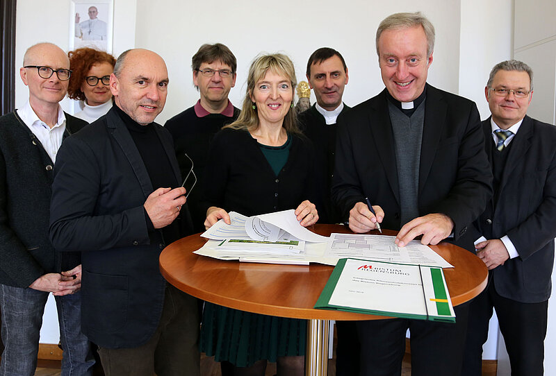 Gemeinsam mit der Klimaschutzmanagerin Summerer und dem Vertragspartner Friedl freuen sich Generalvikar Fuchs, Hans Gfesser vom Bischöflichen Sekretariat, Domkapitular Thomas Pinzer als Leiter und Beate Eichinger als Koordinatorin des diözesanen Klimaschutzprojektes über diese zukunftsweisenden Schritte. Die Umsetzung des diözesanen Klimaschutzkonzeptes wird als Bestandteil der Nationalen Klimaschutzinitiative vom Bundesumweltministerium finanziell gefördert.