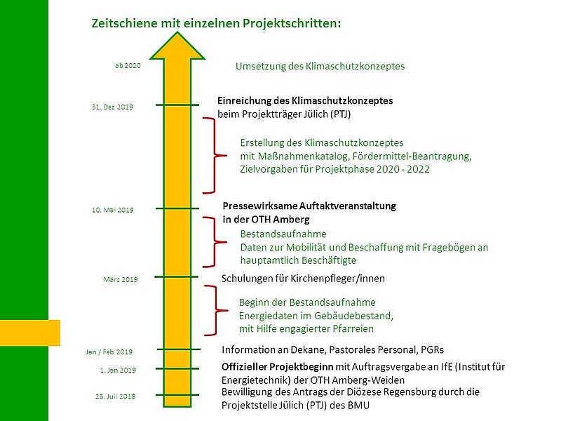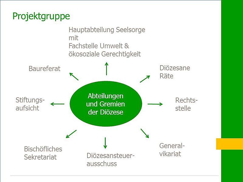 Die Arbeitsgruppe Klimaschutzkonzept mit zwölf Mitgliedern aus den hier gezeigten Gremien und Abteilungen des Ordinariats startete nach einigen Vorarbeiten offiziell zum 1. Januar 2019. Die Projektleitung hat Domkapitular Thomas Pinzer übernommen, die Koordination wurde der Umweltbeauftragten Beate Eichinger übertragen. Bis 31. Dezember 2019 erstellte die Projektgruppe ein Konzept, das verschiedene Verbesserungsziele und Maßnahmenpakete für die drei Handlungsfelder Gebäude/Energie, Mobilität und Beschaffung definiert.