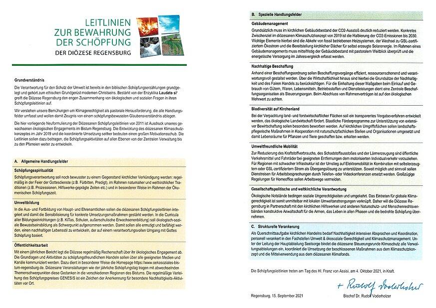 Schöpfungsleitlinien 2021 der Diözese Regensburg von Bischof verabschiedet
